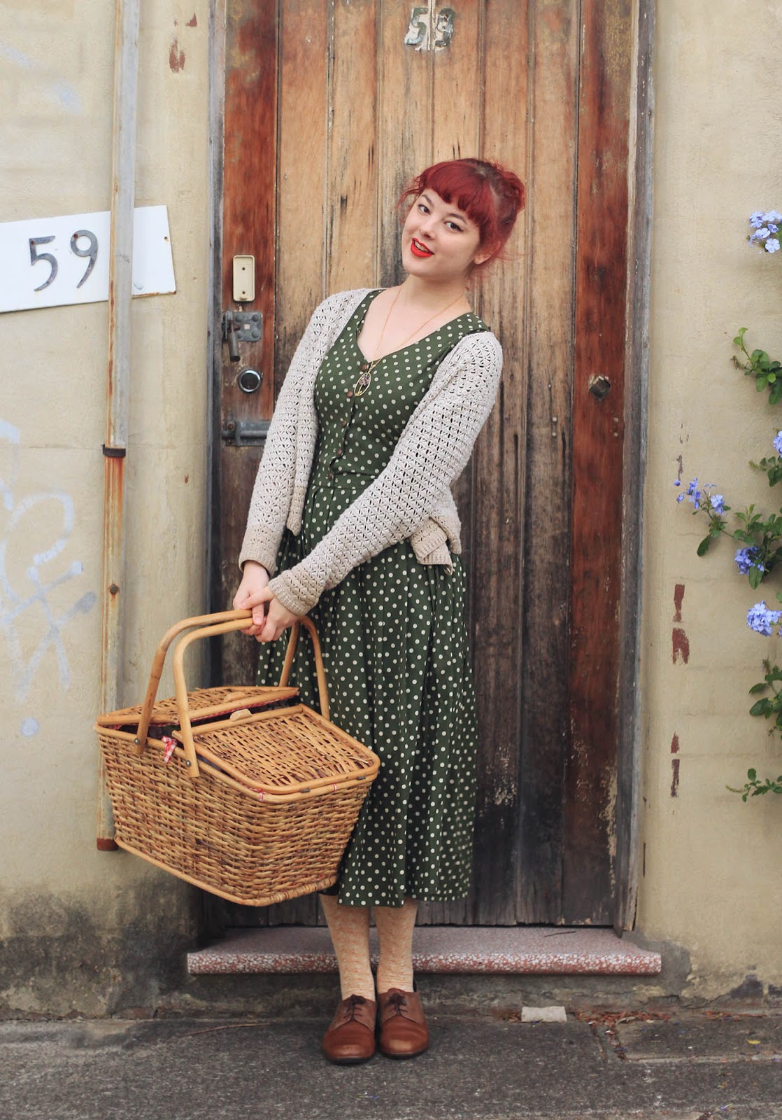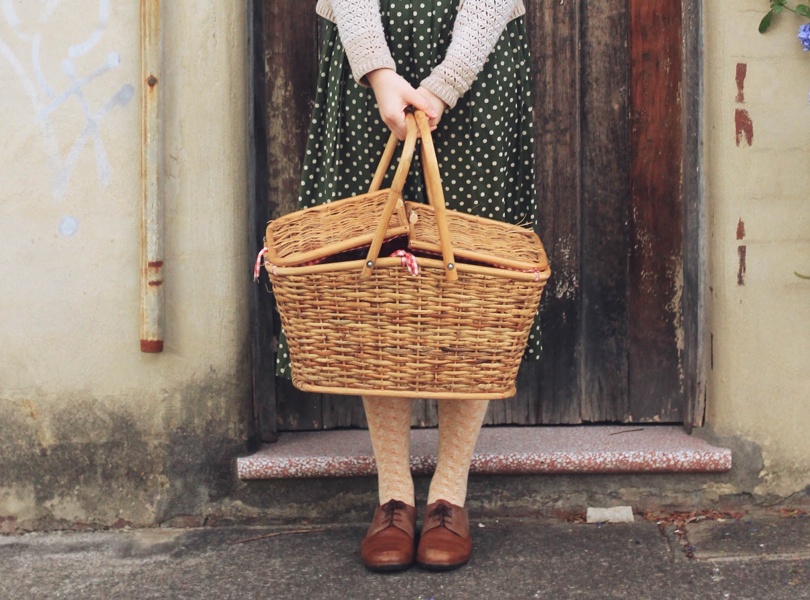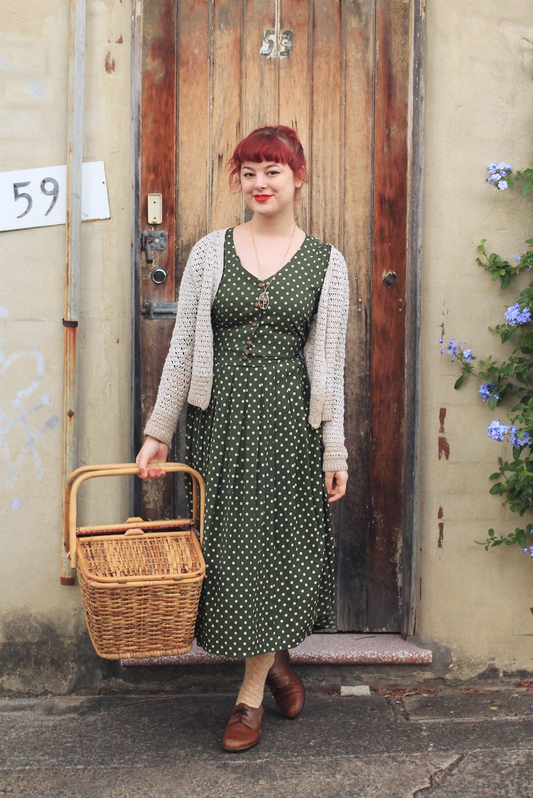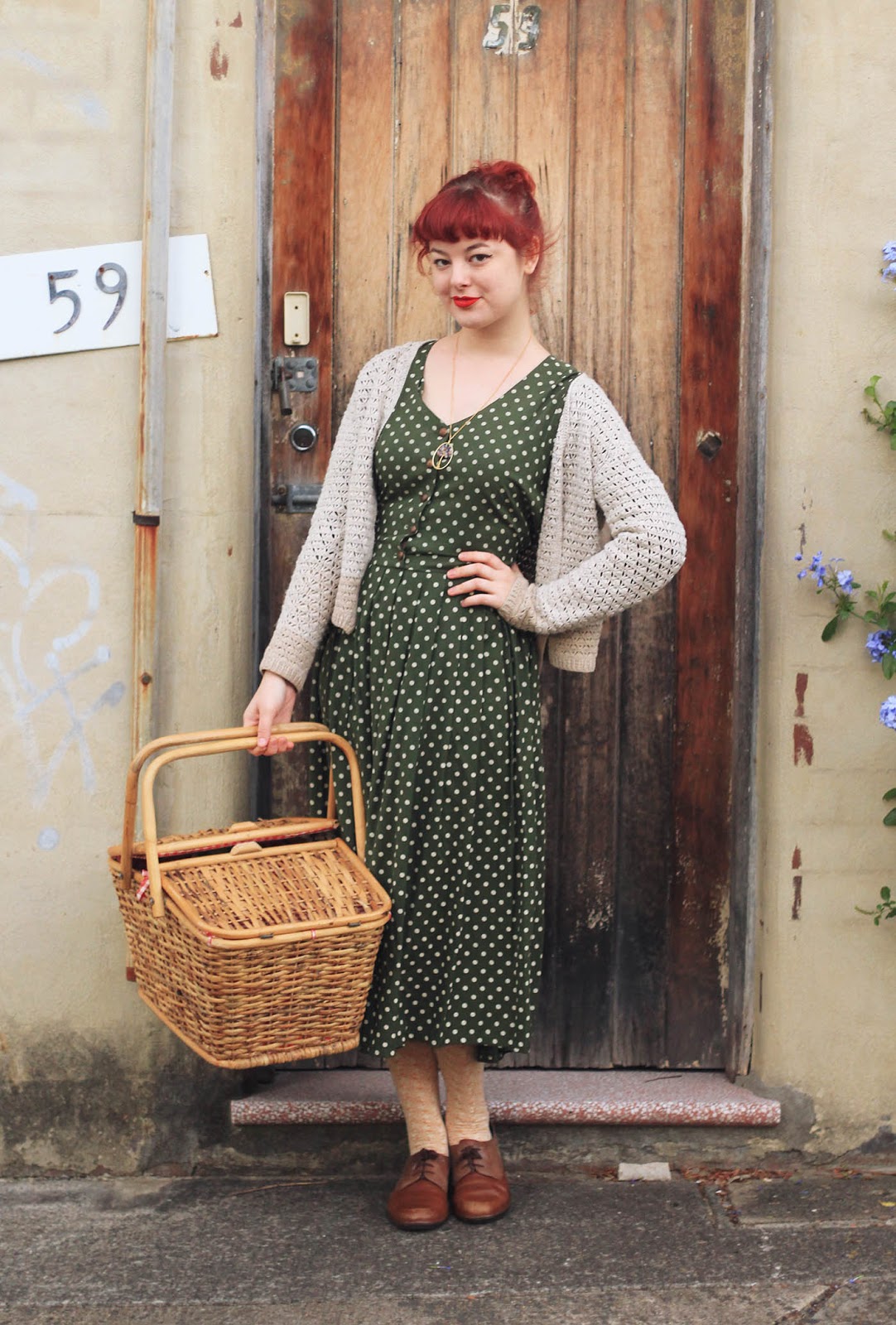 Dress is thrifted | cardigan and basket are thrifted | necklace c/o Eccentric Electricity | shoes are Naot | tights are OKOK