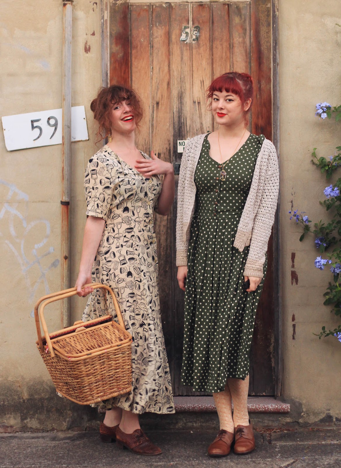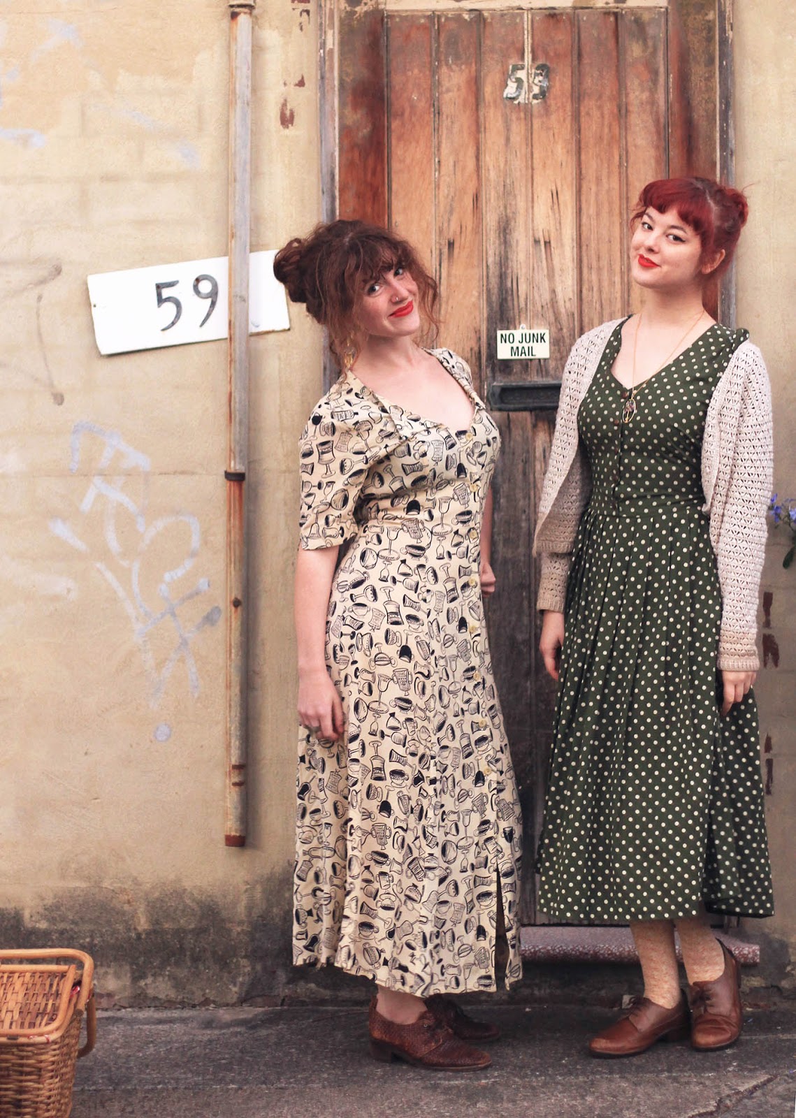 This week Craft n' Crumble Tuesday also became Craft, Crumble and CAMERA Tuesday (eh, eh?) with me and the wonderful Katie deciding to put on our very best floppy thrift shop dresses to take these rather silly photos. And no, we weren't going on a picnic or anything - this picnic basket is apparently just Katie's new handbag now. I like it.