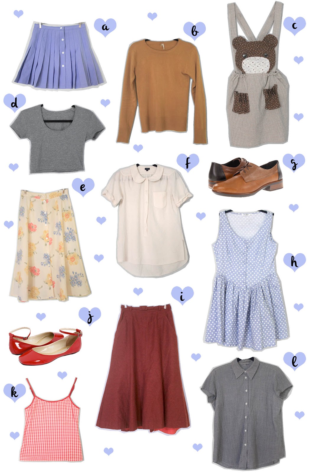 a: thrifted b: thrifted c: DIY d: DIY e: vintage f: thrifted g: Naot h: thrifted i: vintage j: Yeswalker k: thrifted l: thrifted