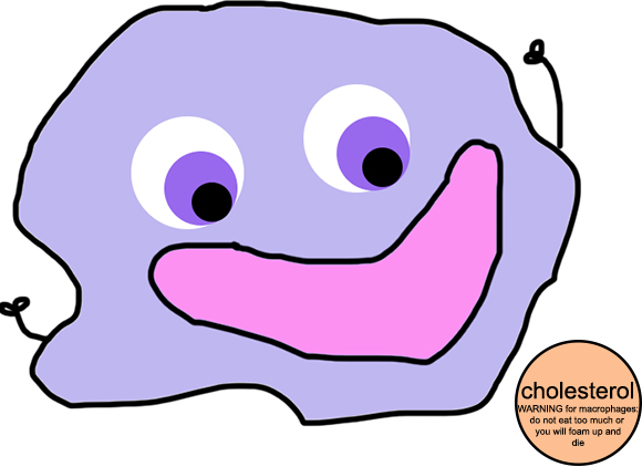 Macrophages just can't get enough of that sweet sweet cholesterol, and will gobble it up whenever they see the chance. Unfortunately, when the cholesterol levels in your blood are way too high, the macrophages ingest WAY too much cholesterol, become all foamy, die, and make plaques which stick onto your blood vessels. Too much of this, and undesireable things like strokes and heart attacks ensue - and that's why too much cholesterol is a bad, bad thing.
