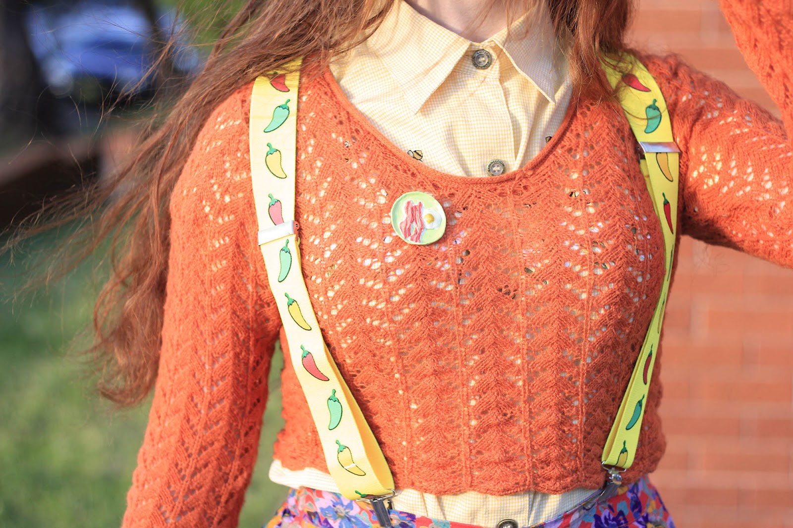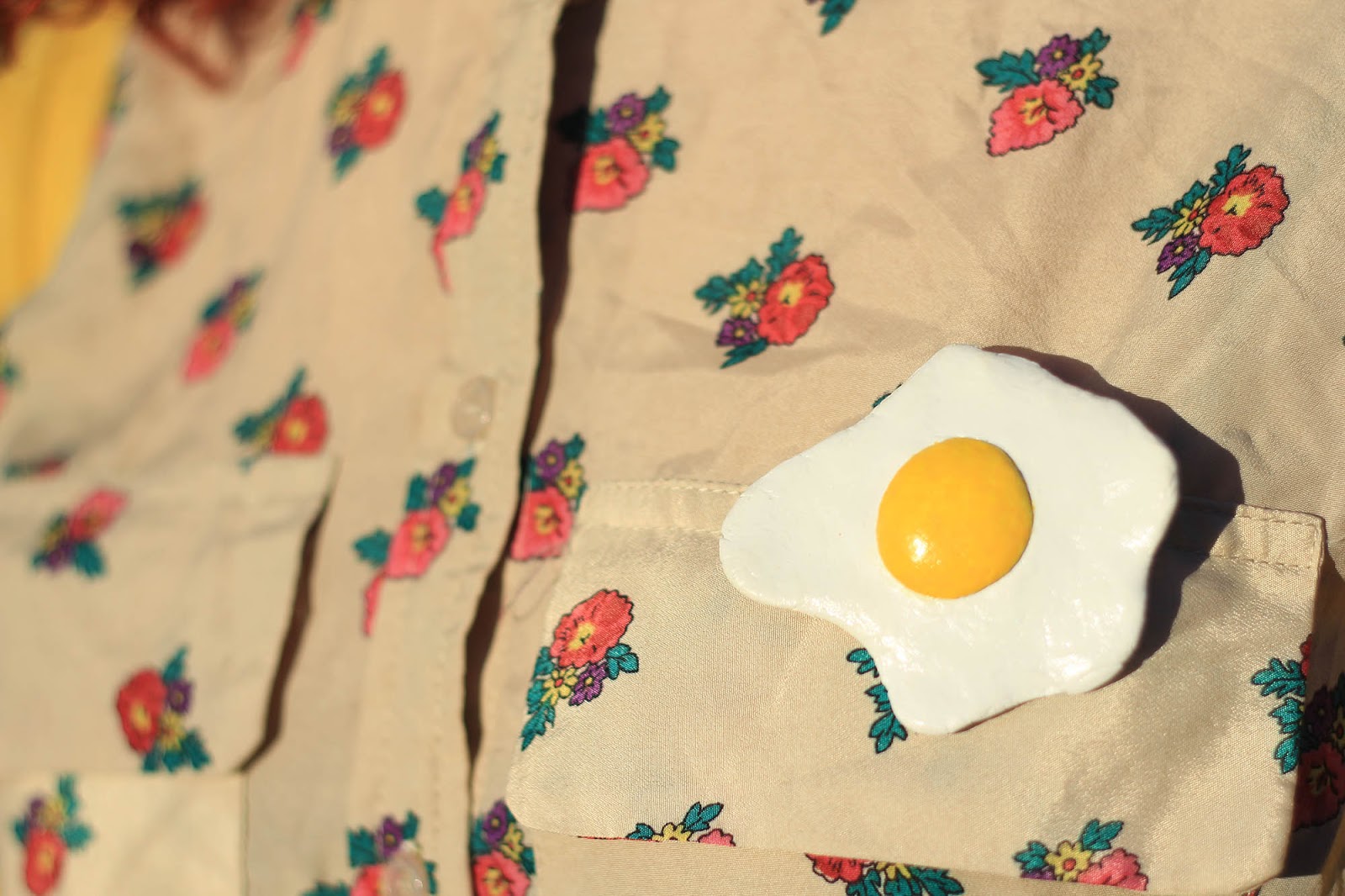Katie: Everything is thrifted except for handmade egg brooch and earrings (made by us!)