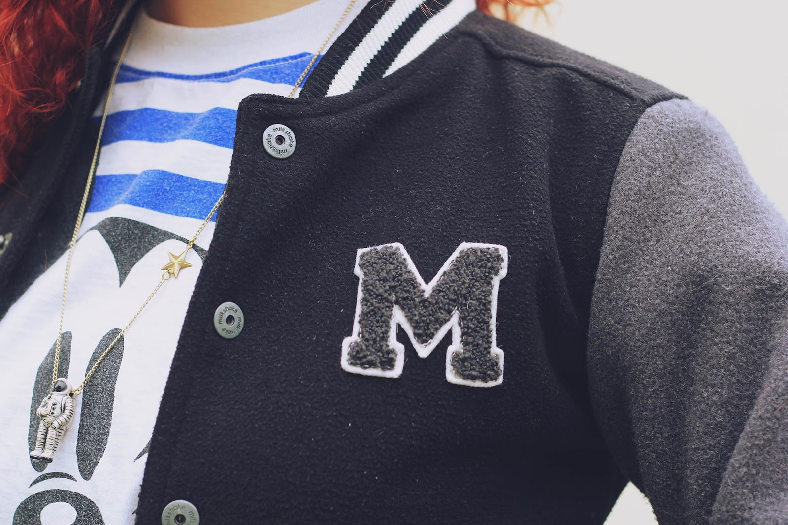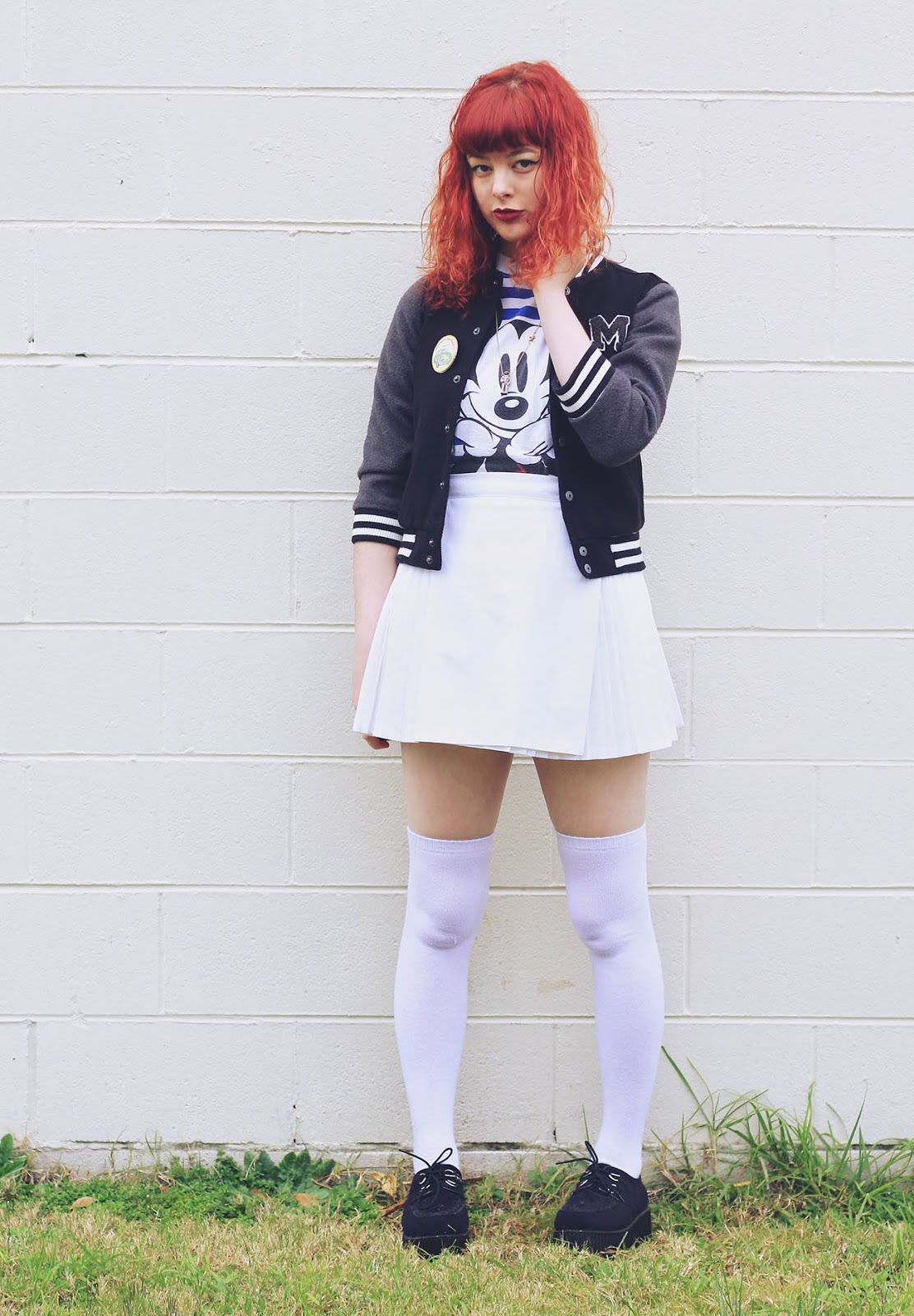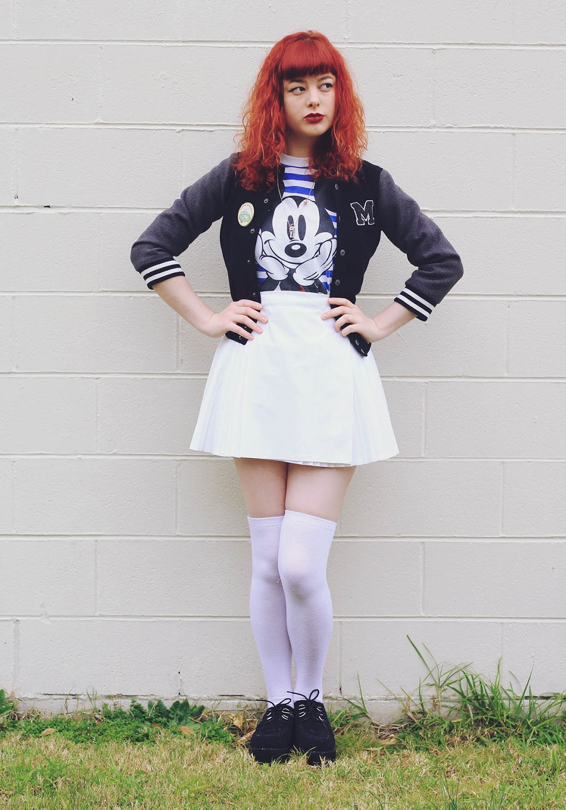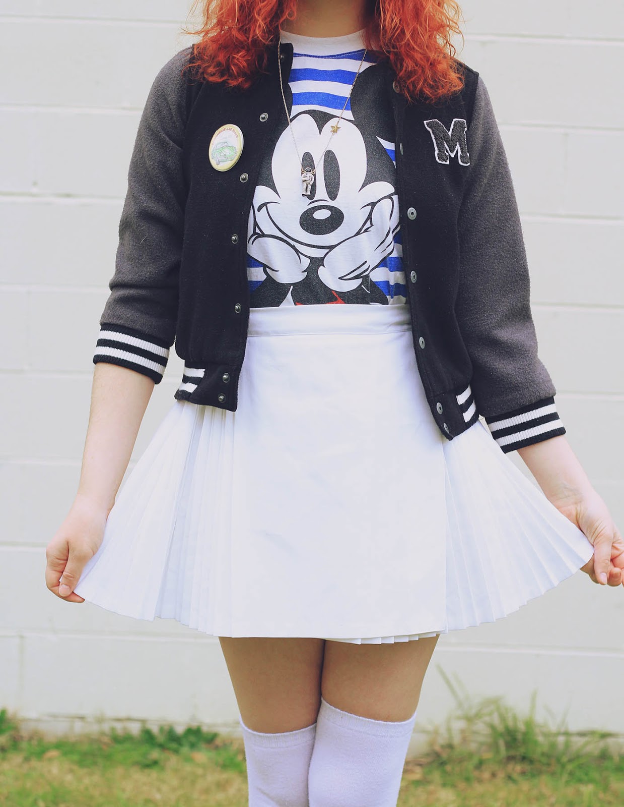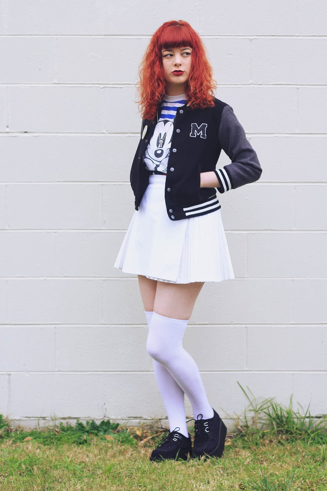 WHY AM I SO SURLY IN THESE PHOTOS? Clearly I have a lot of angst. However, I'm pretty happy with my mostly-thrifted outfit today, and the fact that I found both this Mickey Mouse shirt and varsity jacket on the same day - score!