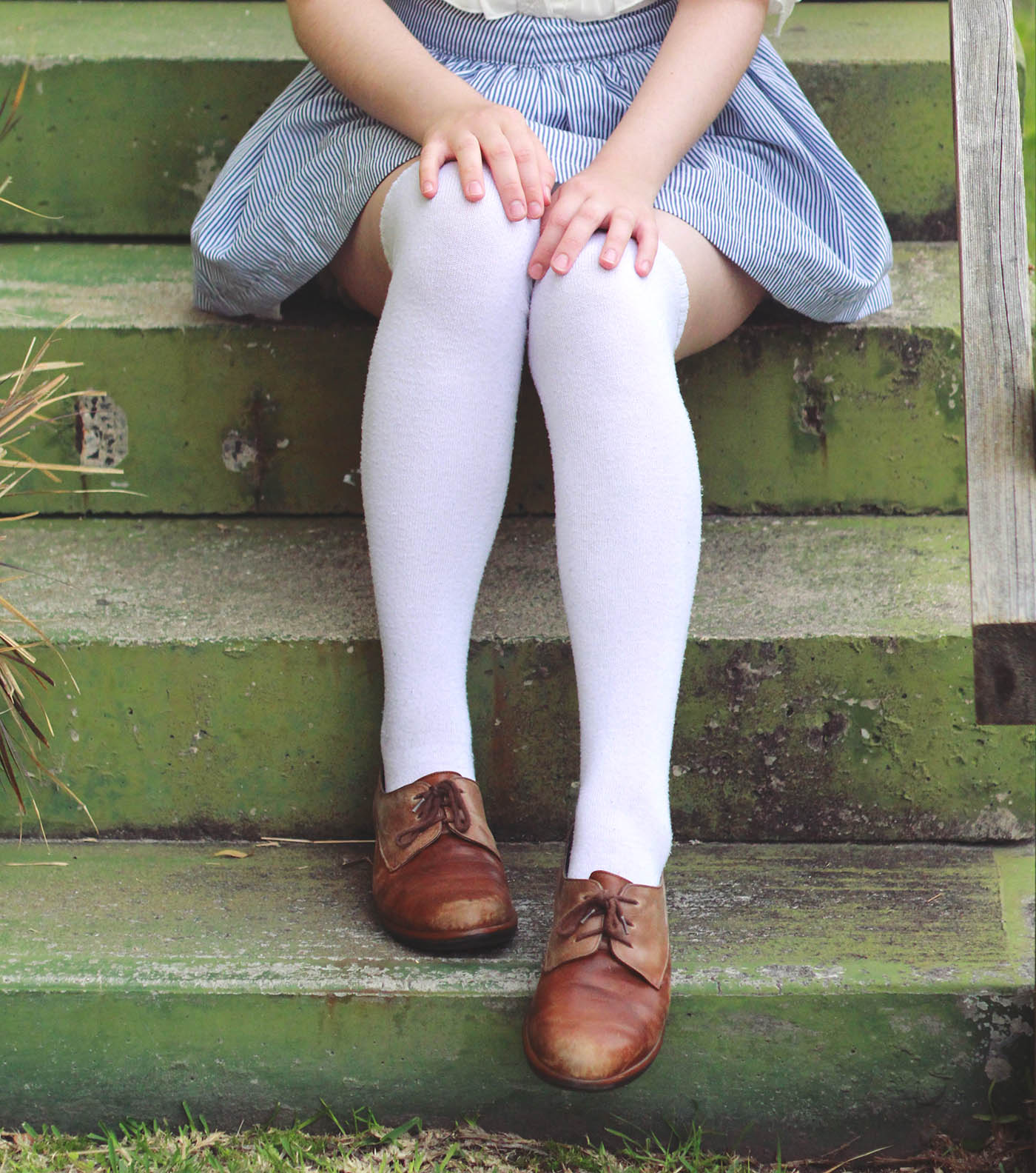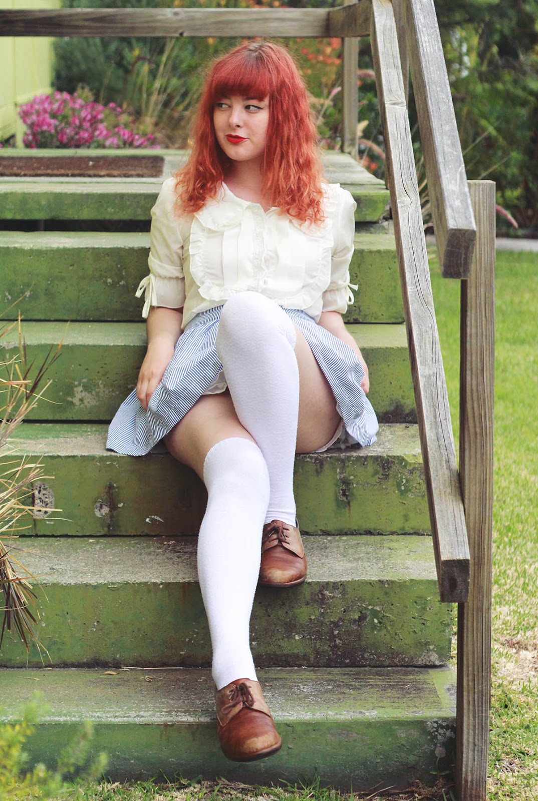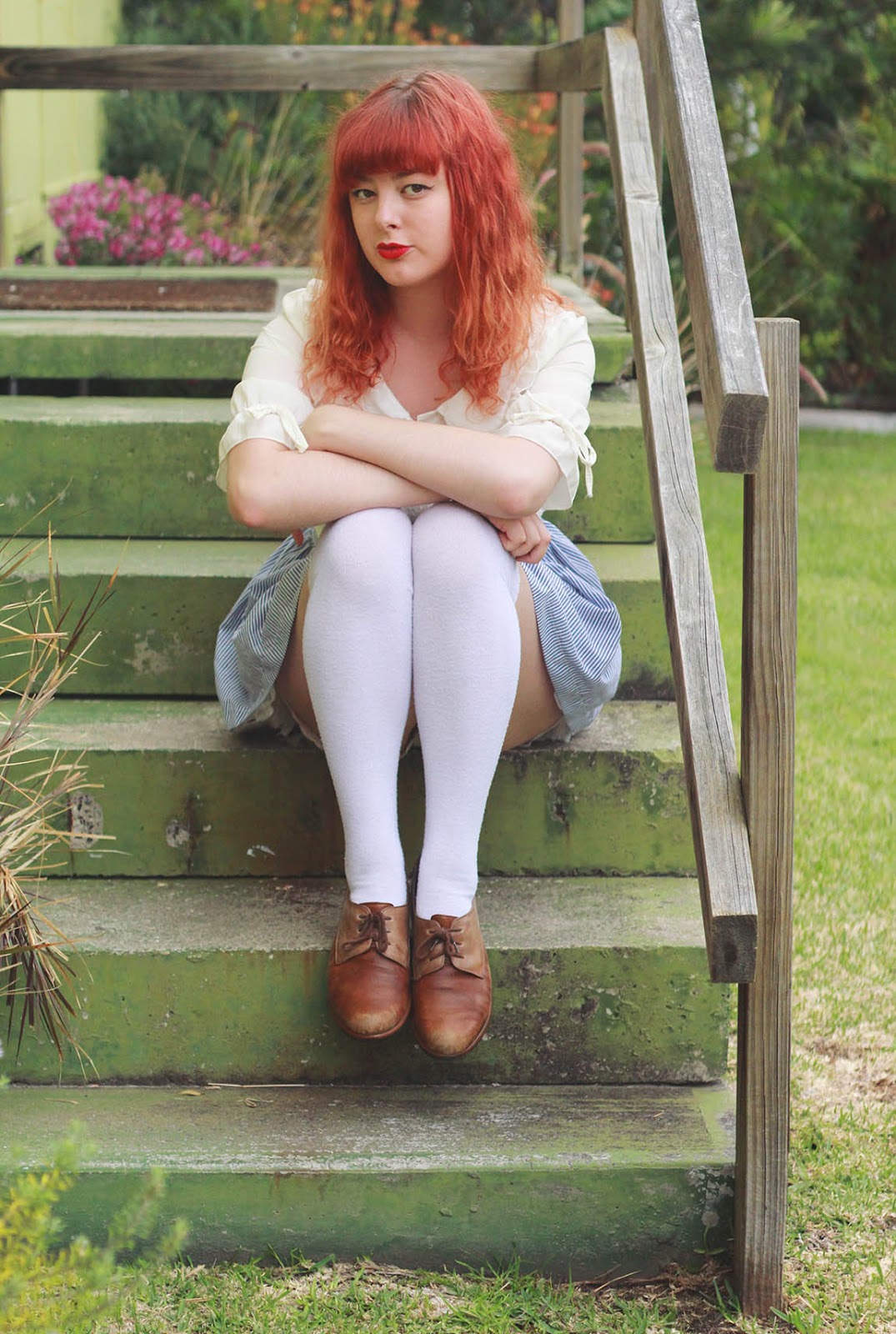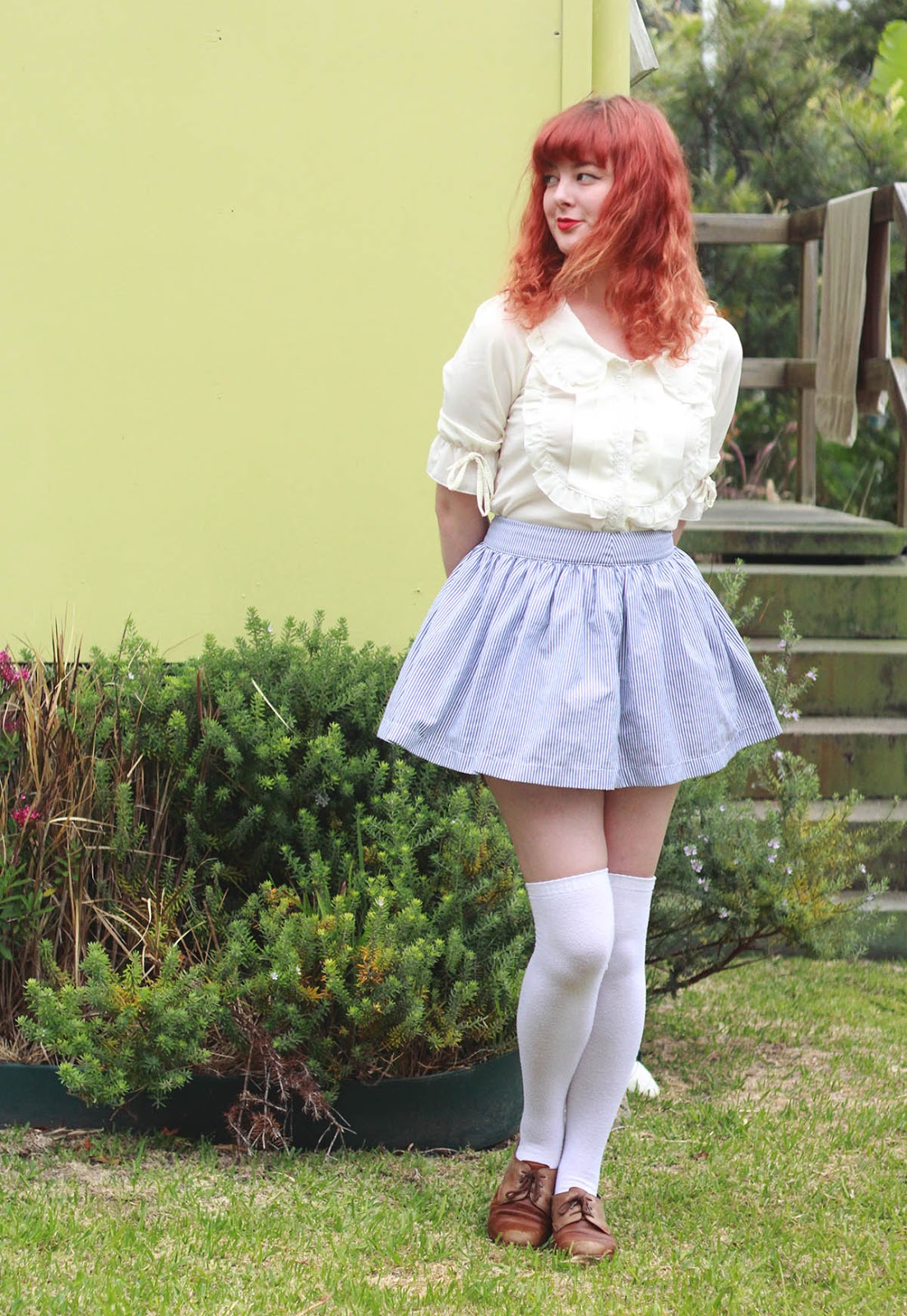 Seasons greetings and happy end of the year! This is a simple look that I wore down to the beach last week. The blouse and the skirt are recently thrifted items - the blouse being $1 from a girl who was selling all her old clothes at a market stall. I wore my favourite ever lace bloomers underneath, which are perfect for short skirts and dresses, and look particularly cute when paired with knee-high socks. Sadly, the bloomers are so loved that they're completely falling apart at the seams. I'm going to have to learn how to make some for myself very soon!