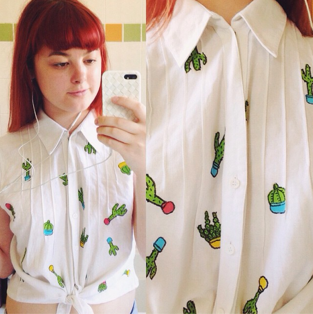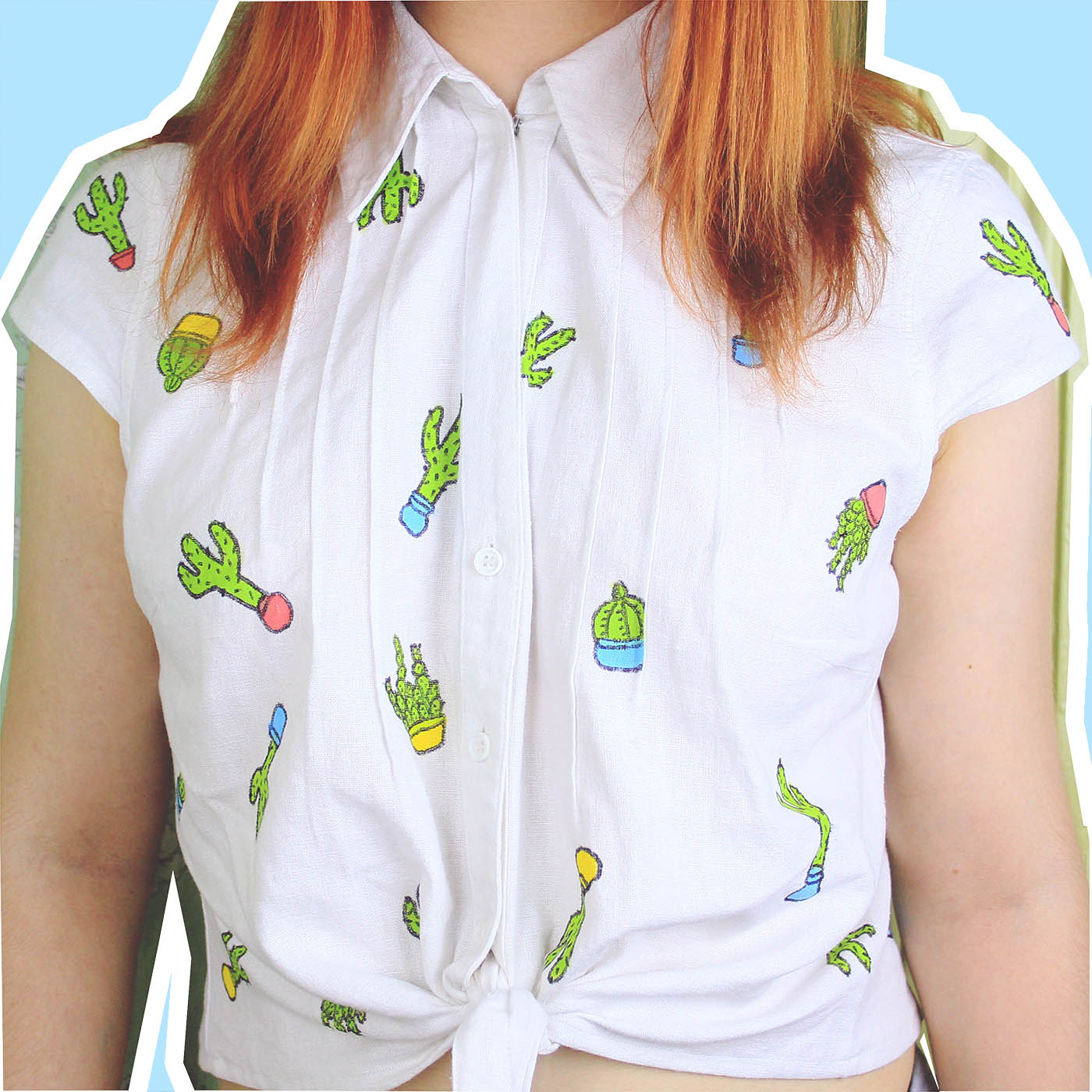 Yesterday I got bored of owning a bunch of plain white shirts, so I decided to draw cacti all over one of them. I also cropped the shirt, added ties and performed a simple alteration to make it button up to the neck.