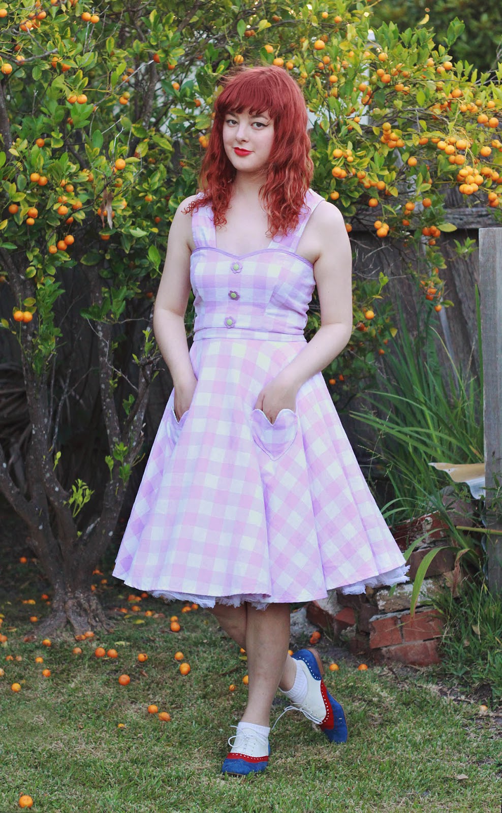(apart from the bias tape around the bust and zipper which were separately thrifted) from a bedsheet that I picked up from the thrift store the other day - even the buttons! I made up my own pattern for this dress (and yes I am working on a tutorial for it!), and I'm very happy with how it fits! I just used a basic circle skirt pattern for the bottom half, making it a little bit longer than I usually make my circle skirts to give it more of a "vintage" feel. The heart pockets were a brilliant suggestion by Carbon Chic - seriously, Demi has been like my sewing fairy godmother for the past year or so, because she is always inspiring me and giving me amazing ideas for my sewing! They were the perfect finishing touch that my dress required. I'm super excited because Demi is actually coming to visit me this weekend in Sydney. As well as going op-shopping together, we're aiming to join creative forces and have some kind of "sew-off" session - I'm really looking forward to what will result!