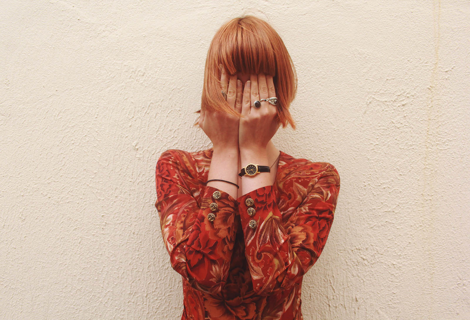 Dress is from Mee & Gee | various rings and watch are all thrifted