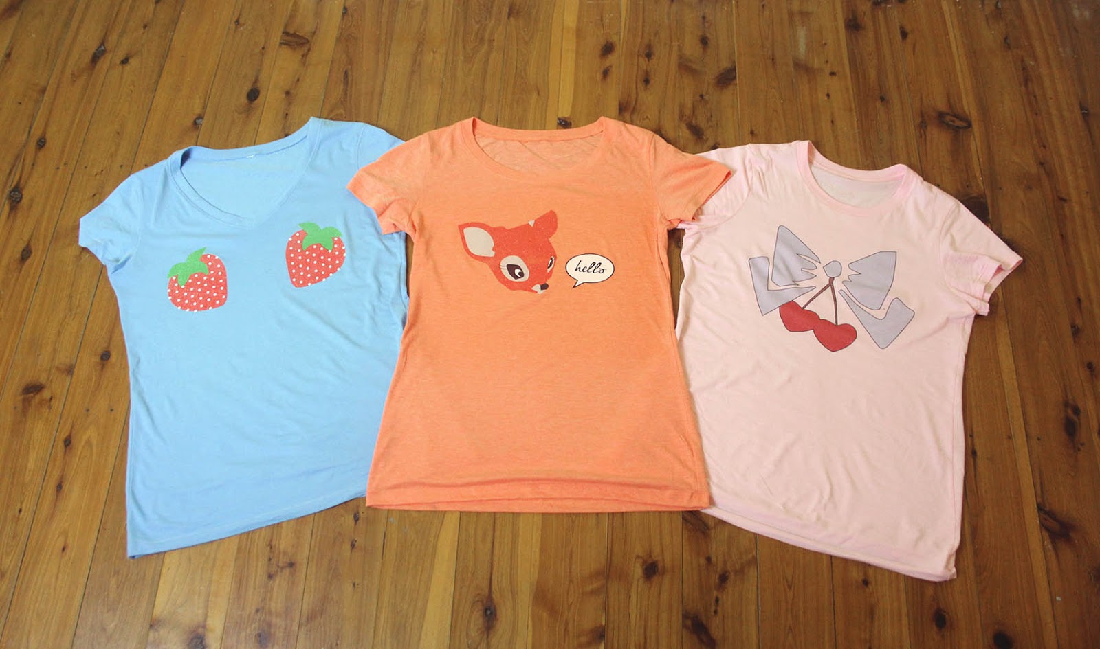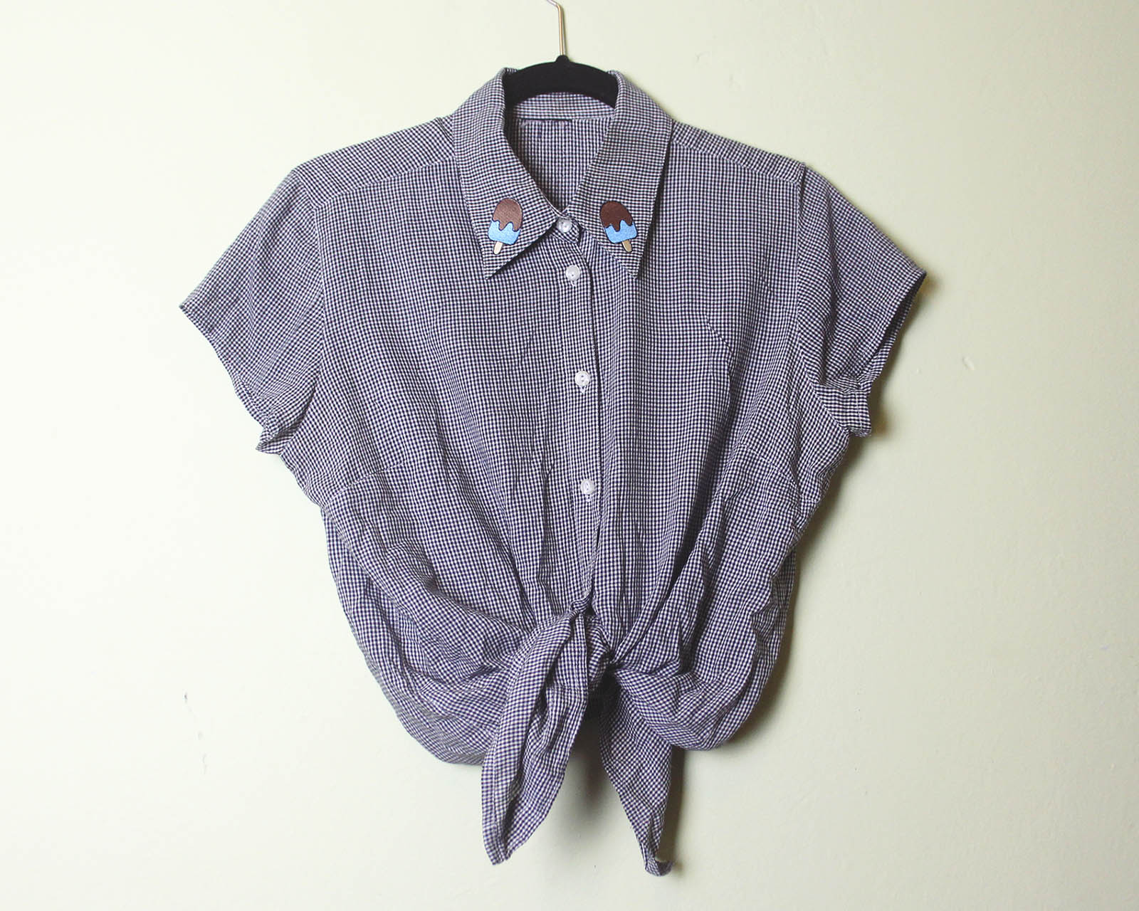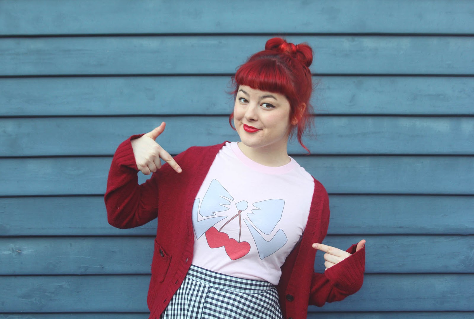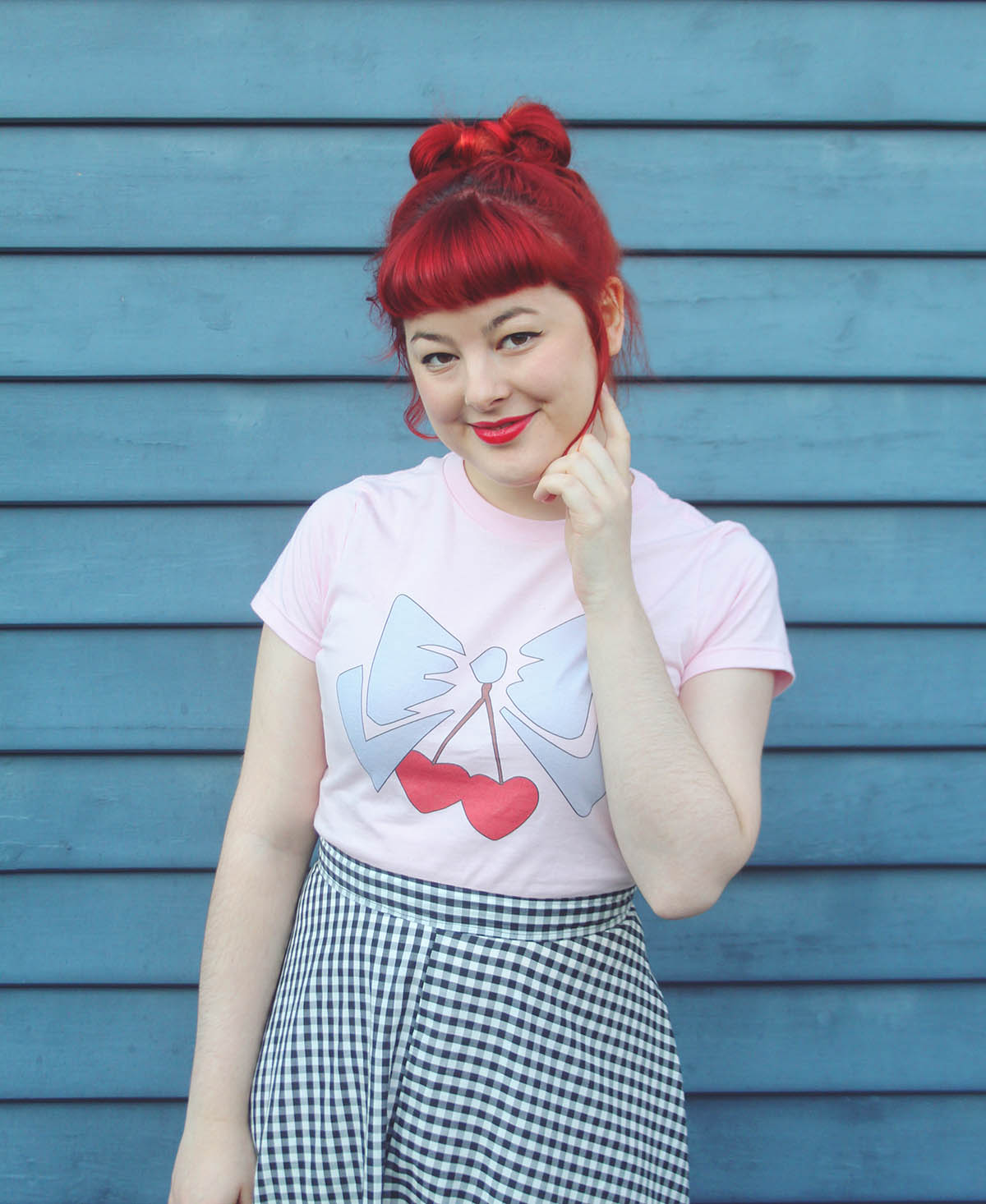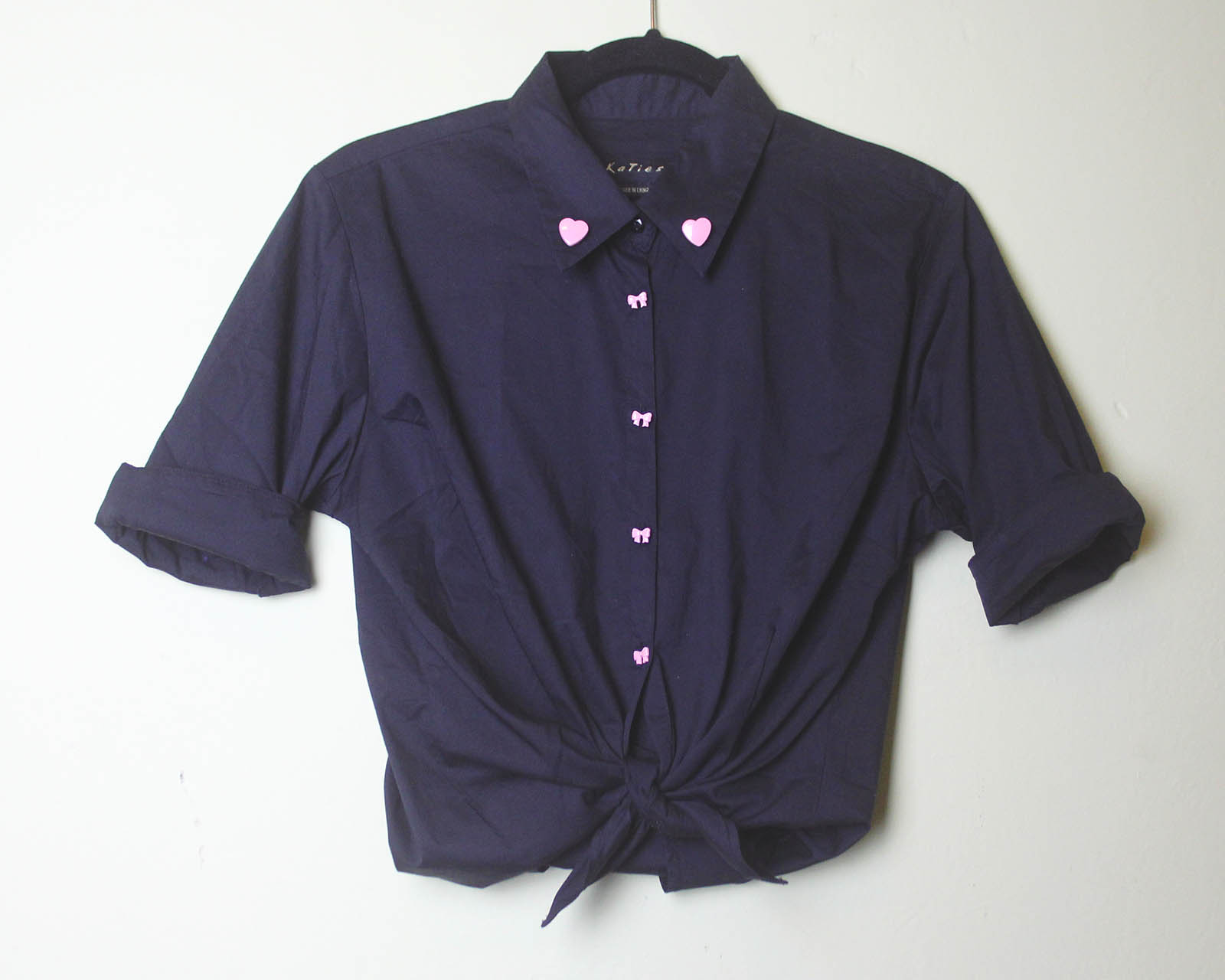 The three shirts are inspired by Japanese street style, vintage patterns and designs, and all things kitsch. This pastel pink shirt was designed to look really good with gingham, denim and red lipstick. The bow also is a sly reference to the Sailor Scouts!
