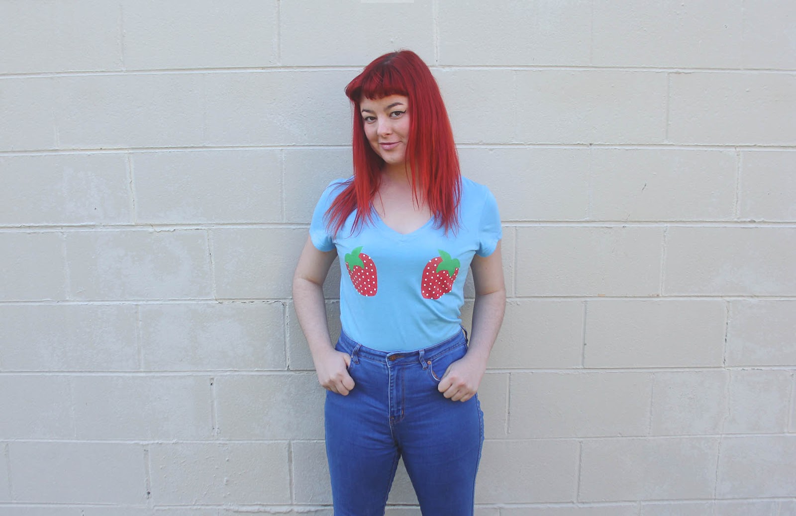 And finally - I love anything with a food print on it. And who doesn't want strawberry boobs? This shirt looks best paired with high-waisted jeans and pleated tennis skirts.
