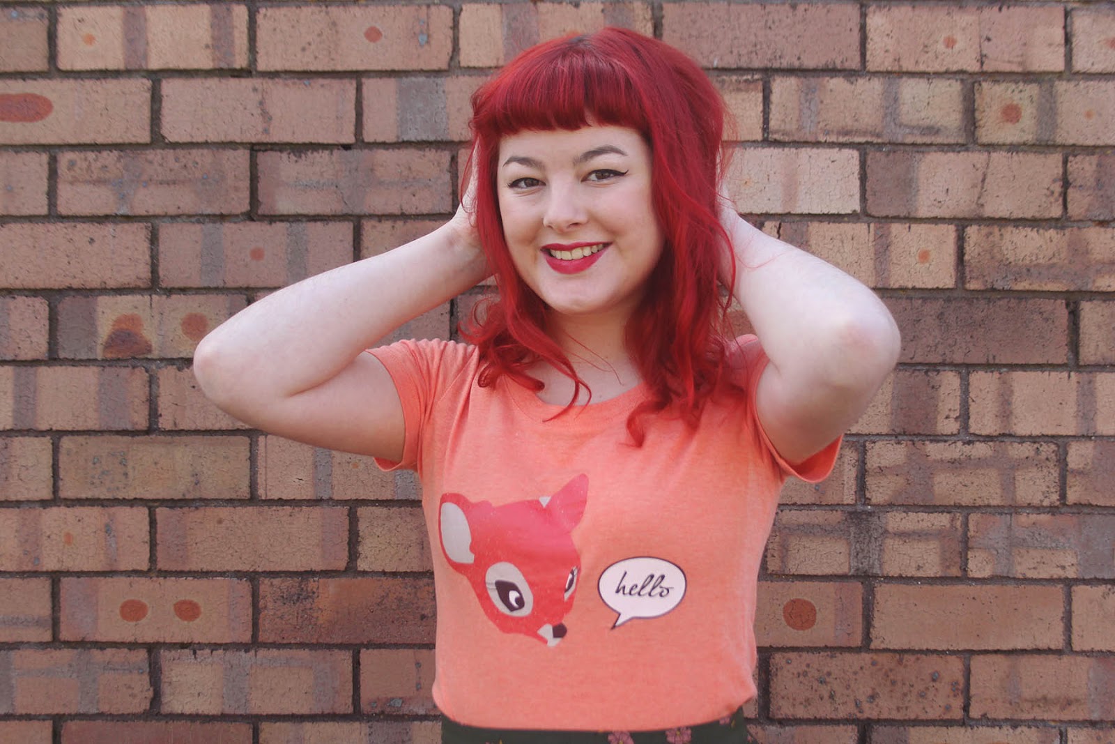 I also fell in love, a little while back, with this Fiona Hewitt kitsch deer design and 1960s fawn knickknacks like these! I wanted to evoke this in my t-shirt. I was also inspired by my friend Katie, who once wore a bambi jumper with a brooch saying "hello" in a genius pairing. In a pastel peach colour, this shirt looks great with denim, black and white, and anything with orange tones in it!